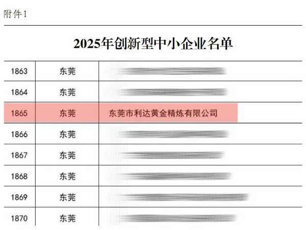近日,广东省工业和信息化厅发布《关于2025年创新型中小企业和通过复核的创新型中小企业名单的通知》,万象城体育集团旗下东莞市利达黄金精炼有限公司(以下简称“东莞利达精炼”)凭借卓越创新能力,成功获评2025年广东省创新型中小企业。